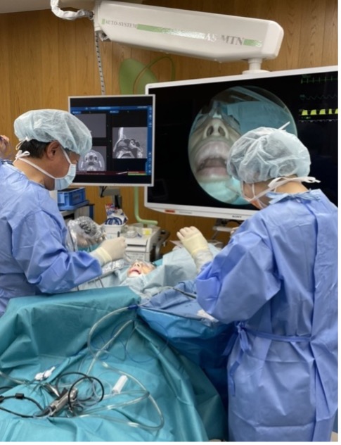 内視鏡下鼻副鼻腔手術風景:内視鏡を鼻内に入れ、テレビ画面で術野を拡大し、副鼻腔の細かな部位を繊細に操作します。さらにCT画像に手術部位をナビゲーションで確認し、脳や目の位置を確認しながら安全に手術を行っています。